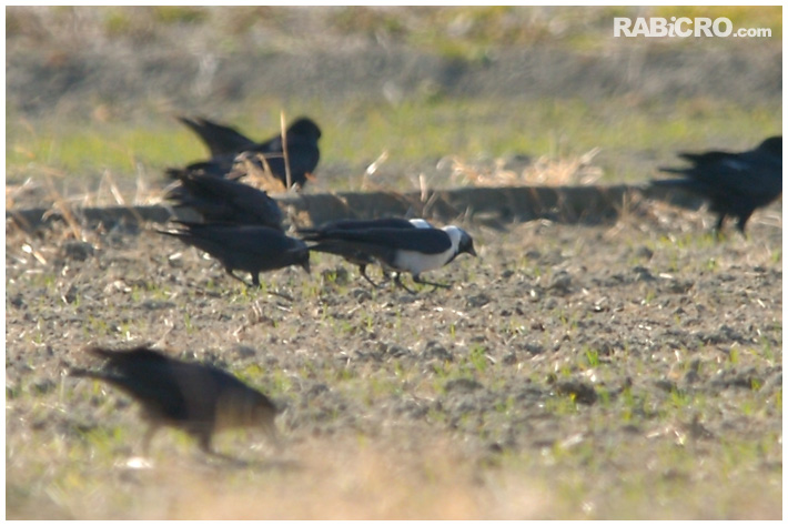 こくまる君(コクマルガラス)とミヤマガラスです。白黒のやつがコクマルガラスの淡色型ですぐ後ろのやつが暗色型ですね。そして、周りにいるのがミヤマガラスです(^^。こくまる君はハトぐらいの大きさでミヤマガラスはその二回りぐらいの大きさでした。こくまる君ってかわいい声で「カァ」と鳴くらしいのですが私は聞けずじまいでしたぁ。 ここで風が強くなってきたので次のポイント(葦原)へ移動しました。コミミ、ハイチュウを探そう!ってことですけどポイントは相変わらず凄い風。結局ここでは風に流されていくカラスが飛んでいただけだったような 。 。 。