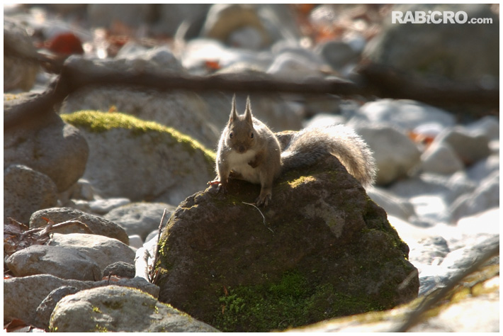 何かと思えばリスさん(ホンドリス)が石の上で毛繕いをしています。慌てていたので露出設定を修正できずぶっ飛びですが、まぁいつものことで(^^ゞ。ここでは良くリスに出会います。次回こそ。ね! そうこうしていると近くの枝にお客さんが。