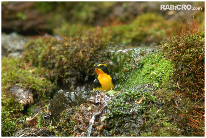 これはちょっと立ち止まって見上げているポーズですね。うぅ、かわいいです。そうそうσ(^^)、♂♀合わせてもコルリは初認です。去年戸隠で見逃してからもう既に一年。ようやくリベンジが叶いました。コルリと言うからには瑠璃色の♂を見たかったのですが、これは今度のお預けですね。 で、ここまで撮影して忘れ物を取りに車へ。現場に居残る奥さんに、(鳥さんが)出たらシャッター押しておいてと言い残し、車から戻ってみると奥さんがカメラと格闘しています(^^。 ![]() きびっち(キビタキ♂)がお風呂に入っていました。水浴びの合間にこちらを確認しているようです。しかし、奥さんもなかなかやりますねぇ。これに味をしめてゴーヨンとか言わないかしら(^^。もちろん私は大賛成するけどなぁ(爆)。